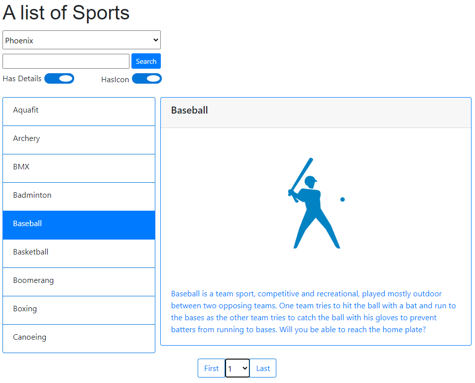 - The text input field allows you to search for specific sports. You must click the search button to fire the search.